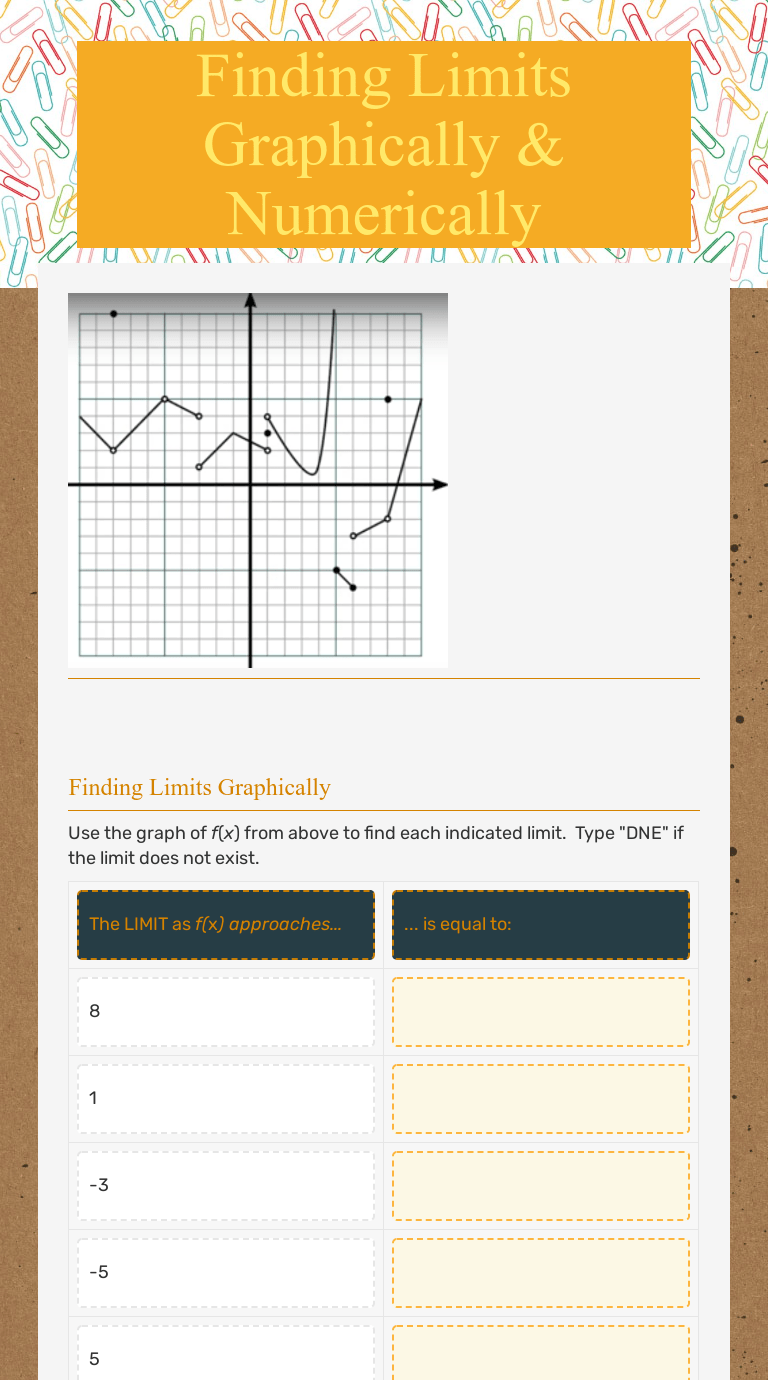 Limits Graphically Worksheet / Ap Calculus Exam Review Limits And Continuity Magoosh Blog High School /. For each graph, determine where the function is discontinuous. Given a function , the limit of as approaches is a real number if can. Use a graphing utility to graph. Section 1.2 finding limits graphically and numerically. 1) using the graph at the right, identify the.